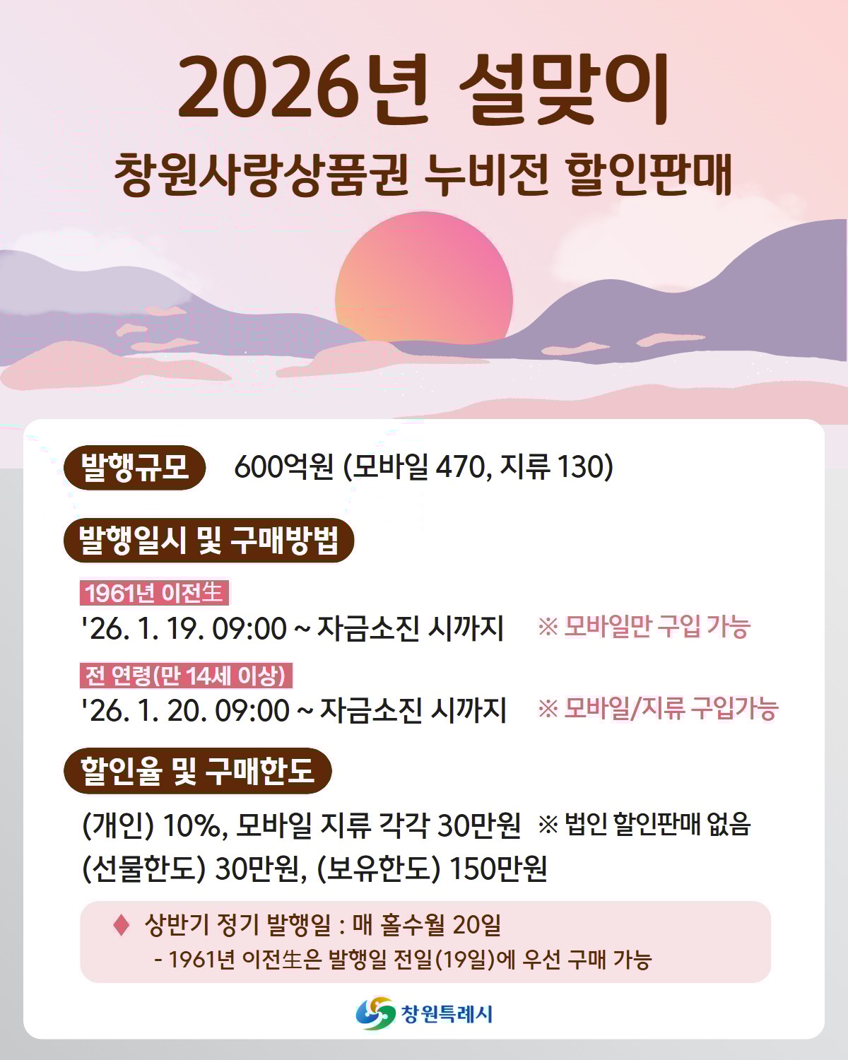 창원특례시는 2026년 설 명절을 앞두고 지역 내 소비 촉진과 소상공인 매출 증대를 위해 창원사랑상품권 '누비전' 600억원을 발행한다고 7일 밝혔다. 지난해 설 명절 200억원 발행 규모 보다 3배 확대된 수준이다.