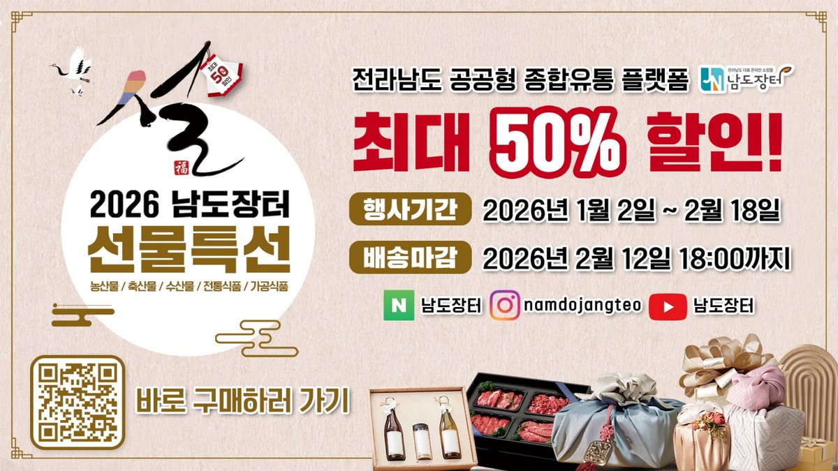 남도장터는 2월18일까지 대규모 설 명절 기획전을 전개한다. 물가 부담은 낮추고 농가 소득은 높이는 상생 기획전으로 270개 업체 1400여 개 품목이 참여한다. 이번 행사는 전 품목 20% 기본 할인에 더해 설 선물 전용관 품목은 최대 50%까지 할인가로 제공한다. 1인당 최대 30만원의 할인 쿠폰과 대량 구매 시 최대 15% 추가 할인 등 풍성한 혜택이 마련됐다.