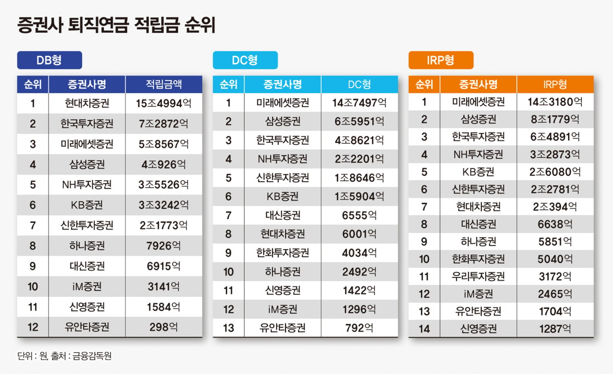 적립금 유입 속도와 증권사별 경쟁력이 갈리며 DB·DC·IRP 부문별로 주도 사업자도 분화되는 흐름이다. 단순한 규모 경쟁을 넘어 유형별 전문성과 사업 전략에 따른 서열이 재편되고 있다는 평가다.