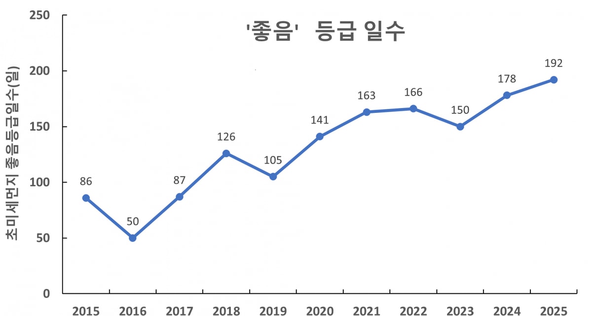 31개 시군 111개 도시대기측정소 측정 결과, 초미세먼지 '좋음' 등급 일수도 종전 최저치였던 2024년(178일)보다 14일 늘어난 192일로 집계됐다. 대기환경 기준 초미세먼지 농도가 15μg/m3 이하일 때 '좋음' 등급으로 분류한다.