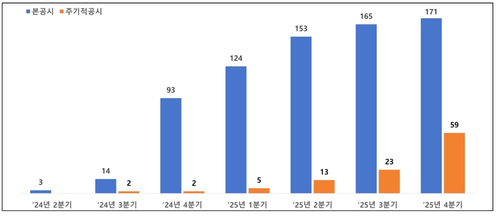 거래소에 따르면 2024년 5월 프로그램 시행 이후 지난해 12월 말까지 본공시 171개사, 예고공시 3개사가 기업가치 제고 계획을 공시했다. 이 중 시행 2년차를 맞아 59개사는 이행 상황을 점검하는 주기적 공시를 제출하며 투자자와의 소통을 이어갔다.