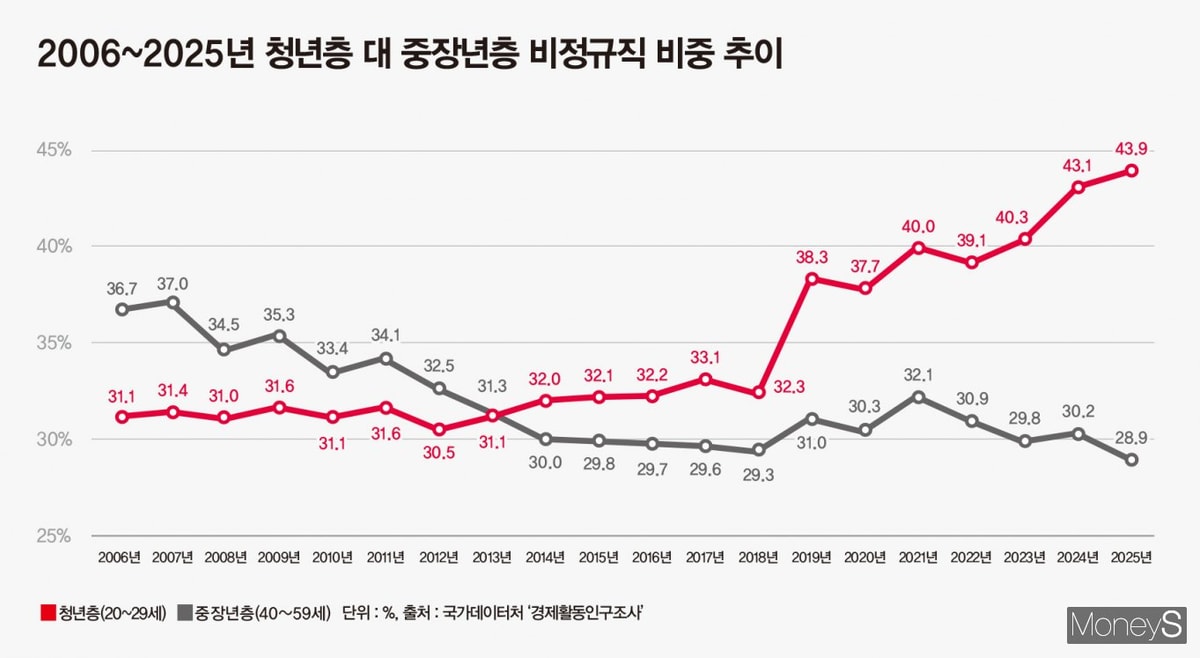 고용의 질적 악화는 더욱 뼈아프다. 지난달 국가데이터처가 발표한 '한국의 사회동향 2025' 보고서에 따르면 청년 근로자 가운데 주 36시간 미만으로 일하는 시간제 근로자 비중이 23.1%에 달한다. 청년 4명 중 1명은 정규직이 아닌 단기 아르바이트 등으로 생계를 유지하고 있다는 의미다.