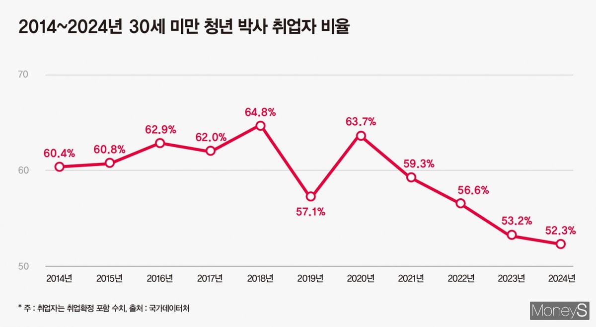 구직활동을 했음에도 일자리를 구하지 못한 실업자가 45.1%였고 2.6%는 구직활동조차 하지 않은 비경제활동인구였다. 박사 학위를 따고도 두명 중 한명이 실업자인 셈이다. 이는 경기 침체로 인한 R&D(연구개발) 예산 축소와 기업들의 경력직 선호 현상, AI 도입에 따른 화이트칼라 일자리 감소가 복합적으로 작용한 결과로 풀이된다. 과거 '취업 프리패스'로 불리던 전문인력조차 노동시장의 구조적 변화 앞에 설 자리를 잃어가고 있다.