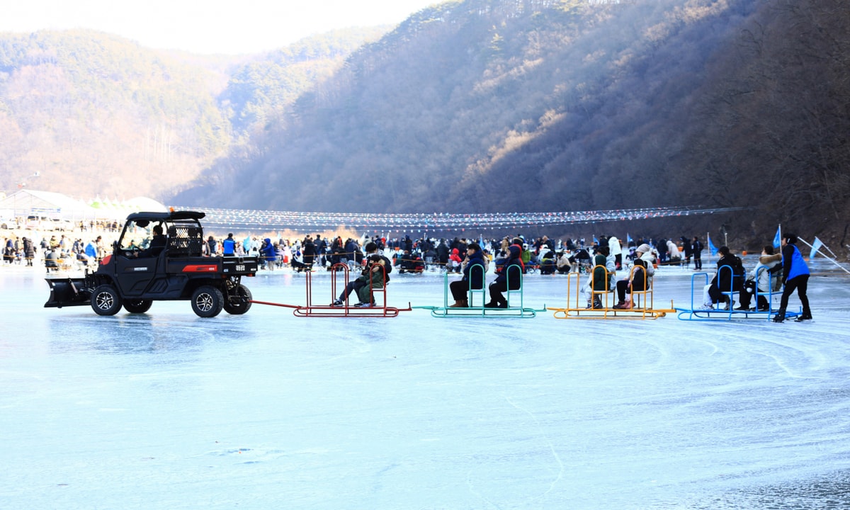 얼어붙은 영양읍 현리 빙상장에서 방문객들이 알록달록한 얼음 썰매에 올라 겨울 축제를 즐기고 있다. 빙판 위에서는 눈썰매 체험과 함께 안전요원과 장비가 배치돼 가족 단위 관광객들이 추운 겨울 속에서도 색다른 체험을 만끽하고 있다. 제3회 영양 꽁꽁 겨울축제는 얼음낚시와 눈썰매 등 겨울 대표 프로그램으로 지역 겨울 관광 명소로 자리 잡고 있다./사진제공=영양군