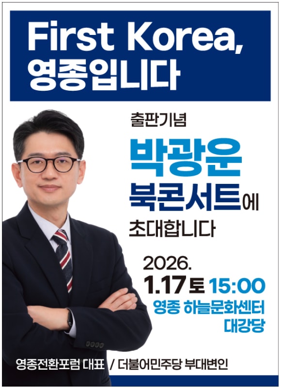박광운 영종전환포럼 대표가 출판기념회를 열고 영종의 미래 비전을 시민과 공유한다. 박 대표는 오는 17일 영종 하늘문화센터 대강당에서 저서 '퍼스트 코리아 영종입니다' 출판기념회를 열고 지역 현안에 대한 진단과 도시 발전 구상을 공개할 예정이다.