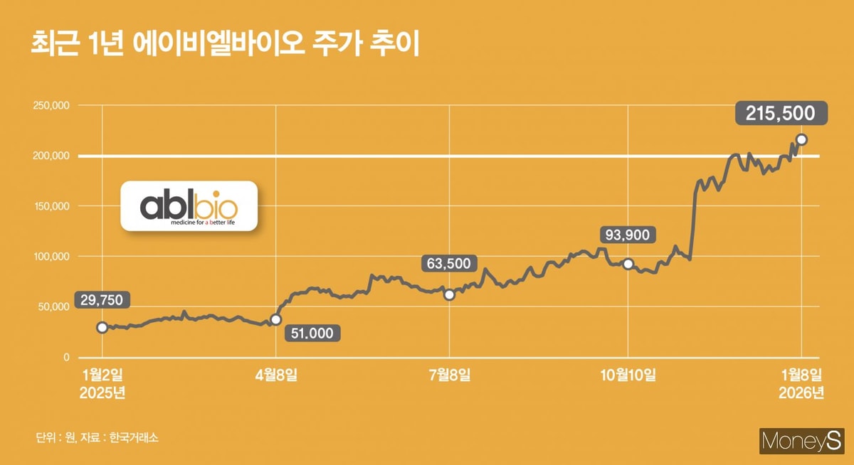 9일 한국거래소 등에 따르면 에이비엘바이오 주가는 지난해 1월2일 2만9570원으로 마감된 뒤 같은 해 12월30일 20만원으로 거래를 마쳤다. 이 기간 주가 상승률은 572.3%다. 올해에는 등락을 반복하며 이날 오전 10시45분 기준 20만6000원 안팎을 기록하고 있다.