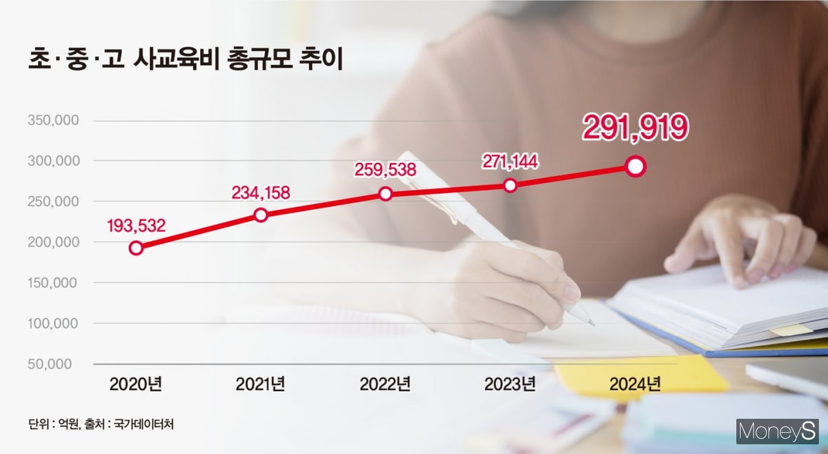 교육부와 국가데이터처가 지난해 발표한 '초중고 사교육비 조사'에 따르면 2024년 기준 초중고 사교육비 총액은 29조2000억원으로 1년 새 2조1000억원(7.7%) 늘어나며 역대 최고치를 기록했다. 학령인구 521만명에서 513만명으로 8만명이 줄어들었지만 오히려 사교육비 지출은 더 많아진 것이다.사교육에 참여한 학생 기준 1인당 월평균 사교육비는 59만2000원이었으나 소득별로 격차가 컸다. 월평균 800만원 이상 가구의 학생 1인당 월평균 사교육비는 67만6000원인데 비해 300만원 미만 가구는 20만5000원으로 3.3배 차이가 났다. 소득에 따라 자녀에 대한 교육 수준이 달라지는 구조적인 문제를 보여주는 지표다.