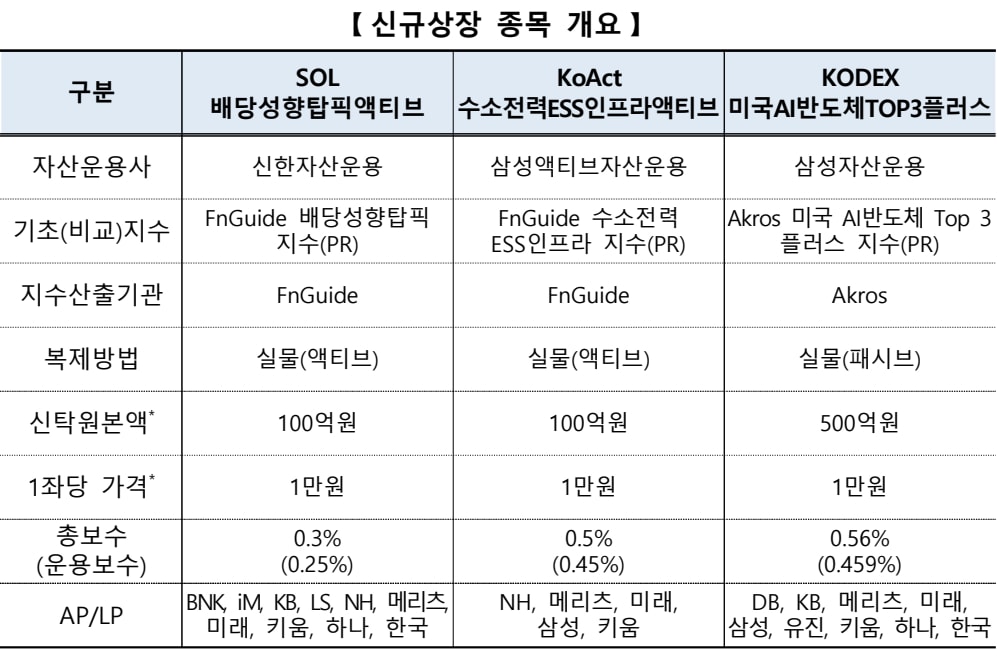 신규 상장 ETF는 ▲SOL 배당성향탑픽액티브 ▲KoAct 수소전력ESS인프라액티브 ▲KODEX 미국AI반도체TOP3플러스 등 3종목이다.