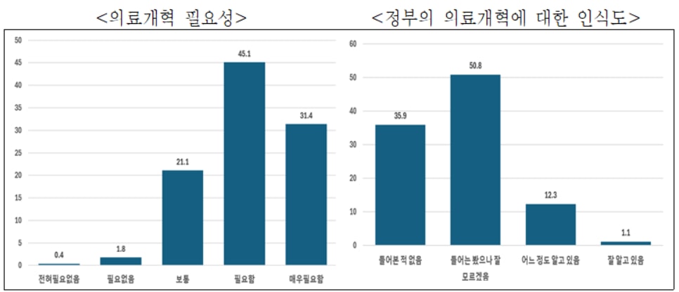 국민 대다수가 지역·필수의료 붕괴를 막기 위한 의료개혁의 필요성에 공감하고 있는 것으로 나타났다. 하지만 정부가 추진 중인 개혁 내용에 대해서는 10명 중 8명 이상이 잘 모른다고 답해 정책 인지도 제고가 시급한 것으로 드러났다.