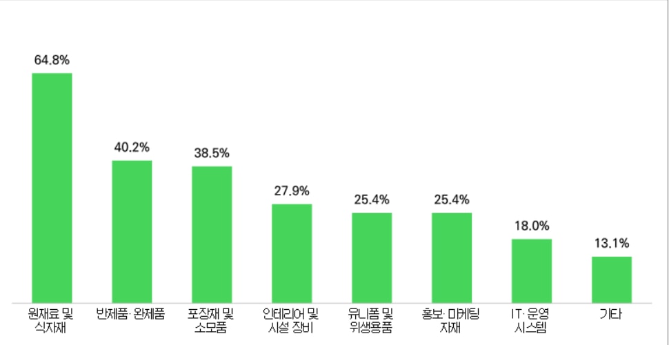 이 밖에도 가맹본부가 구입을 강제하는 필수구입품목의 존재 여부에 대해 가맹본부의 73.8%가 존재한다고 응답했다. 필수구입품목 중에서는 원재료 및 식자재가 64.8%로 가장 높은 비중을 차지했다. 이어 포장재 및 소모품(38.5%), 인테리어 및 시설·장비(27.9%)가 뒤를 이었다. 필수구입품목 범위에 대해서는 가맹본부와 가맹점주 모두 '가맹점 단체와 협의해 결정해야 한다'는 응답이 각각 41%, 58.7%로 가장 높았다.