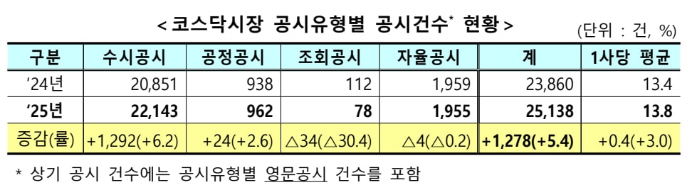 한국거래소는 지난해 코스닥시장 전체 공시건수가 2만5138건으로 전년 대비 5.4%(1278건) 증가했다고 14일 밝혔다.