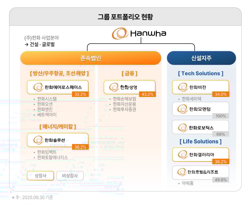 인적분할이 되면 한화비전∙한화모멘텀∙한화세미텍∙한화로보틱스 등 테크 분야 계열사와 한화갤러리아·한화호텔앤드리조트·아워홈 등 라이프 분야 계열사는 신설법인(한화머시너리앤서비스홀딩스)에 속한다. 한화에어로스페이스·한화오션·한화솔루션·한화생명 등 방산 및 조선·해양, 에너지 그리고 금융 계열사는 존속법인에 속하게 된다.