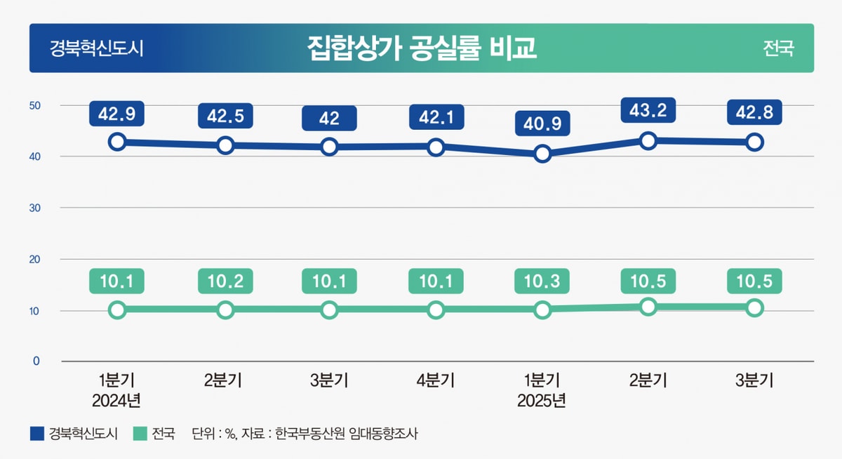 이 같은 상황은 통계로도 확인된다. 한국부동산원에 따르면 경북혁신도시 집합상가 공실률은 지난해 3분기 기준 42.8%로 전국 혁신도시(10.5%)보다 4배 이상 높다. 전국에서 가장 높다.