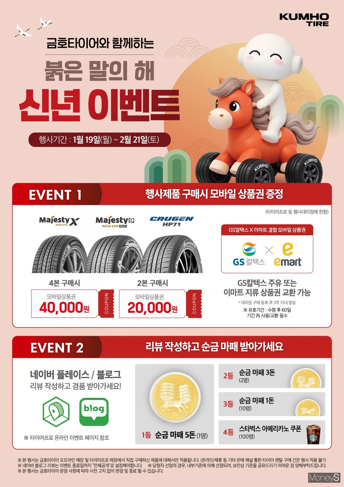 행사 제품을 구매한 고객에게는 GS칼텍스X이마트 결합 모바일 상품권이 제공된다. 또한 금호타이어 승용·SUV제품 2개 이상 구매한 뒤 네이버 리뷰를 작성한 고객을 대상으로 추첨을 통해 순금코인, 기프티콘 등의 다양한 경품으로 증정할 예정이다. 이벤트 관련 자세한 내용은 금호타이어 홈페이지 및 타이어프로 홈페이지를 통해 확인 가능하다.