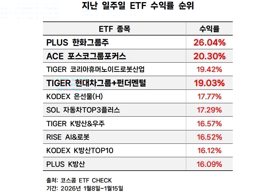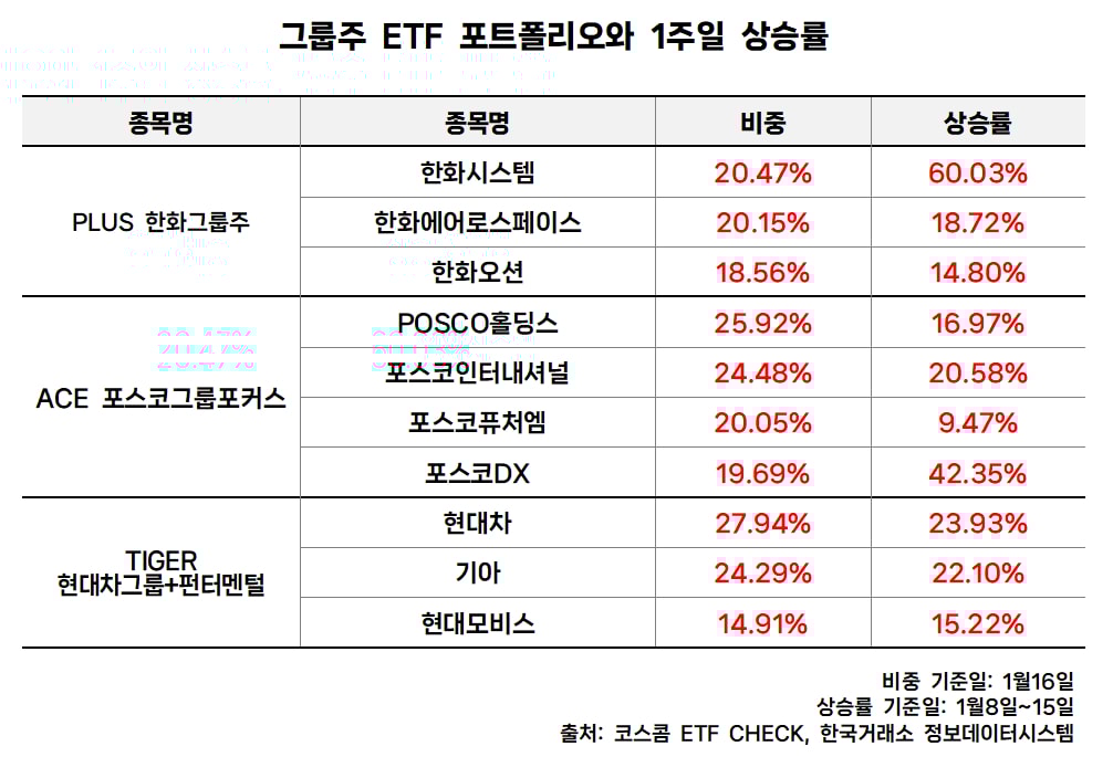 19일 코스콤 ETF CHECK에 따르면 1월8일부터 15일까지 1주일간 수익률 1위는 26.04%를 기록한 PLUS 한화그룹주였다. ACE 포스코그룹포커스는 20.30%로 2위였다. 4위는 TIGER 현대차그룹+펀터멘탈이 19.03%였다. 수익률 상위 5위 중 3개가 그룹주 ETF다.