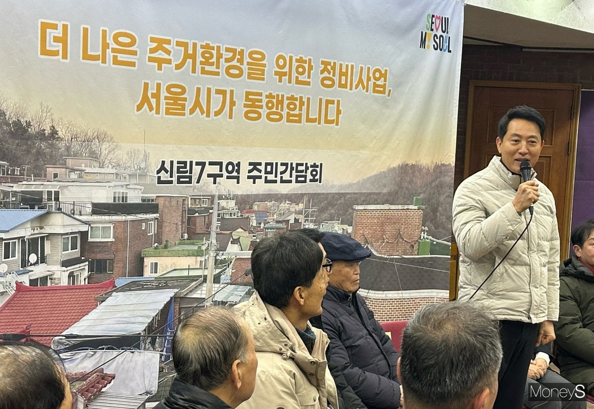 오 시장은 19일 오전 관악구 신림7구역 재개발 현장을 찾아 노후 주거환경을 점검하고 주민들과 현장 간담회를 가졌다. 신림7구역은 관악구 신림동 목골산 자락 경사지에 위치한 노후도 89%의 저층 주거지다. 2011년 정비예정구역으로 지정됐으나 용적률 170% 제한으로 사업성이 낮아 2014년 해제된 뒤 장기간 방치됐다.