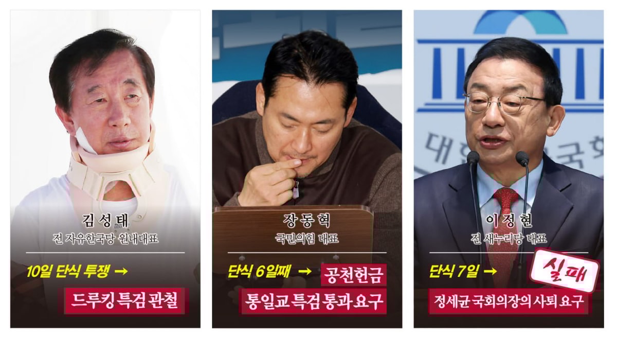 장동혁 국민의힘 대표가 공천헌금·통일교 특검(쌍특검) 도입을 요구하며 6일째 단식 투쟁을 이어가고 있다. 2018년 단식 끝에 문재인 정부의 '드루킹 특검' 수용을 끌어낸 김성태 전 자유한국당 원내대표처럼 성공한 단식으로 기록될지, 2016년 정세균 당시 국회의장 사퇴를 요구 조건으로 내건 이정현 전 새누리당 대표처럼 실패한 단식으로 남을지 주목된다.