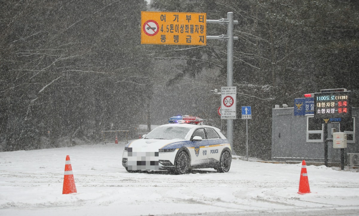21일 최저기온이 영하 17도로 전망되며 전라권과 제주도에는 눈이 내릴 것으로 보인다. 사진은 지난 11일 제주시 어승생 삼거리 입구에서 제주서부경찰서 소속 경찰관이 도로통제 한 모습. /사진=뉴시스