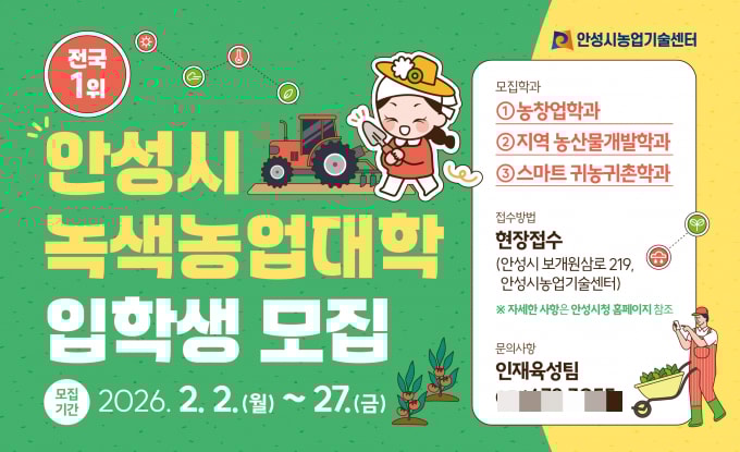 안성시농업기술센터가 다음달 2일부터 27일까지 '2026년도 녹색농업대학' 교육생 60명을 모집한다고 20일 밝혔다.