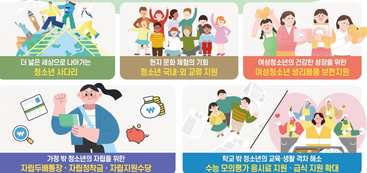 시설에서 퇴소하는 가정 밖 청소년의 자립을 위한 지원사업도 펼친다. 경기도는 이들의 경제적 부담을 줄이고 안정적인 사회 정착을 돕기 위해 '퇴소청소년 재정자립 패키지'를 운영한다. 15세~24세 가정 밖 청소년 대상 '자립두배통장'을 추진해 매월 1만~10만원 저축 시 저축액의 2배를 매칭, 월 최대 20만원, 최대 6년까지 적립을 지원한다.