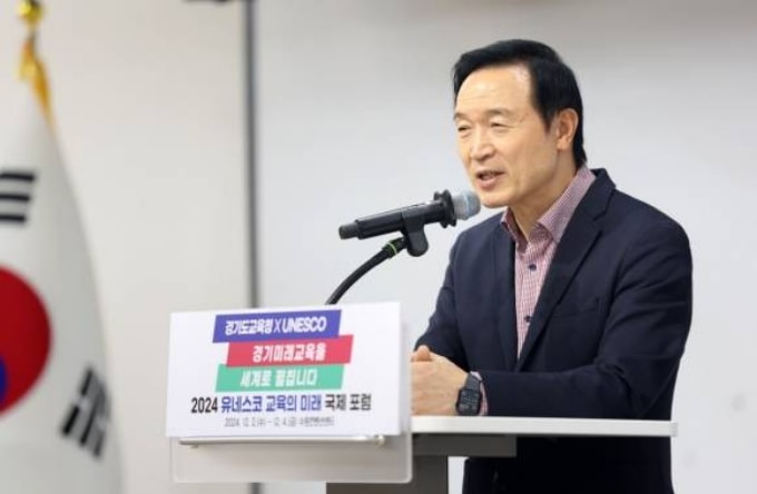 임태희 경기도교육감이 ‘2024 유네스코 교육의 미래 국제포럼’에 참석해 경기미래교육에 대해 설명하고 있다. /사진제공=경기도교육청