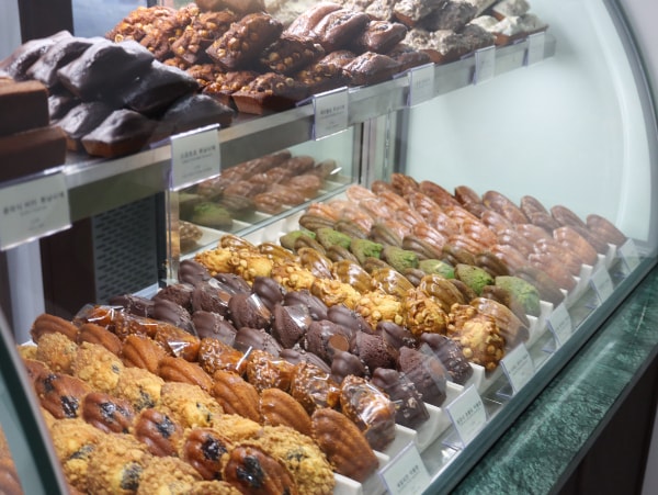 매일 새벽 인근의 작업실에서 구워내는 마들렌과 갸토(세밀한 공정으로 완성하는 구조적인 케이크류)는 이곳의 정체성을 가장 잘 보여준다. 특히 직접 디자인해 특허까지 출원한 조개 모양 마들렌은 매장 전반의 상징이다. 문고리, 조명 등 매장 곳곳에서도 이 형태를 확인할 수 있다.