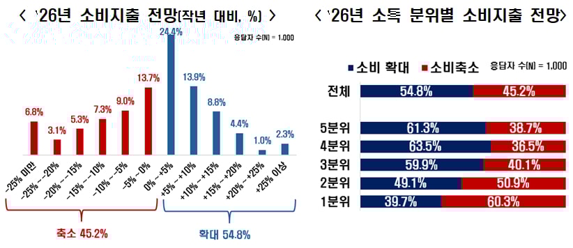 소득수준에 따라 소비계획의 차이를 보였다. 소득 분위별로 살펴보면 소득 하위 40%(1~2분위)는 올해 소비를 작년에 비해 줄일 것이라 응답했고 상위 60%(3~5분위)는 소비를 늘릴 것이라 응답했다.