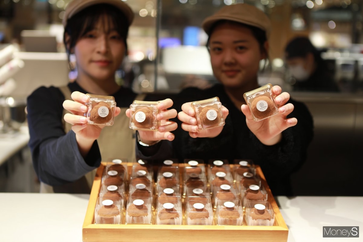 롯데백화점 광주점 지하1층 보향떡집과 베비에르 직원들이 SNS 등에서 인기를 끌고 있는 디저트 '두바이쫀득쿠키'를 선보이고 있/사진=롯데백화점 홍보 3팀 제공.
