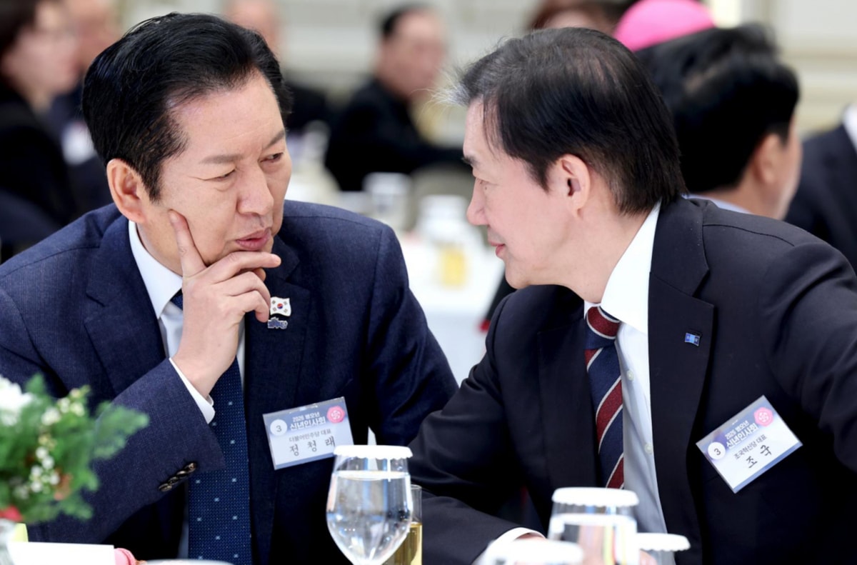 정청래 더불어민주당 대표와 조국 조국혁신당 대표가 지난 1월2일 청와대 영빈관에서 열린 2026년 신년인사회에서 대화를 나누고 있다. / 사진=뉴시스
