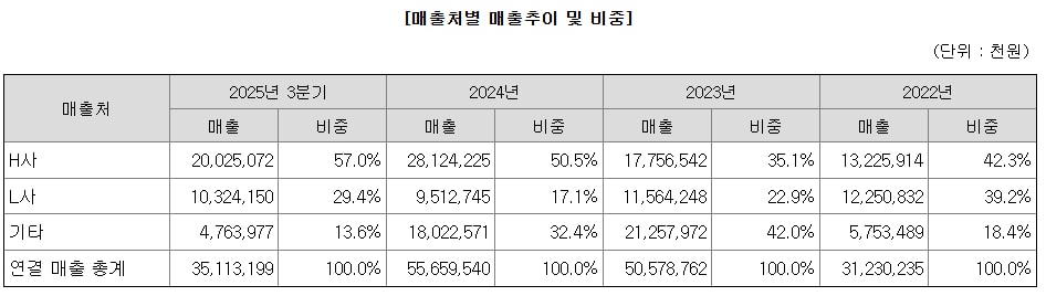 매출처가 편중된 점은 양날의 검이다. 액스비스의 2022년 H사(현대자동차)에 대한 매출 비중은 42.3%였지만 2023년 35.1% 이후 ▲2024년 50.5% ▲2025년 3분기 57.0% 등으로 점점 커지고 있다.