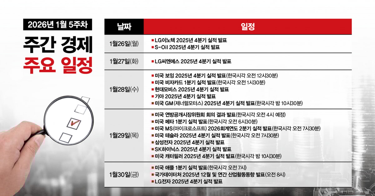 1월 마지막주에는 삼성전자·SK하이닉스·애플·MS(마이크로소프트)·테슬라 등 국내외 글로벌 기업의 실적을 비롯해 미국 Fed(연방준비제도)의 통화정책 결정기구인 FOMC(연방공개시장위원회) 회의 결과 발표 등 굵직한 일정이 예정됐다.