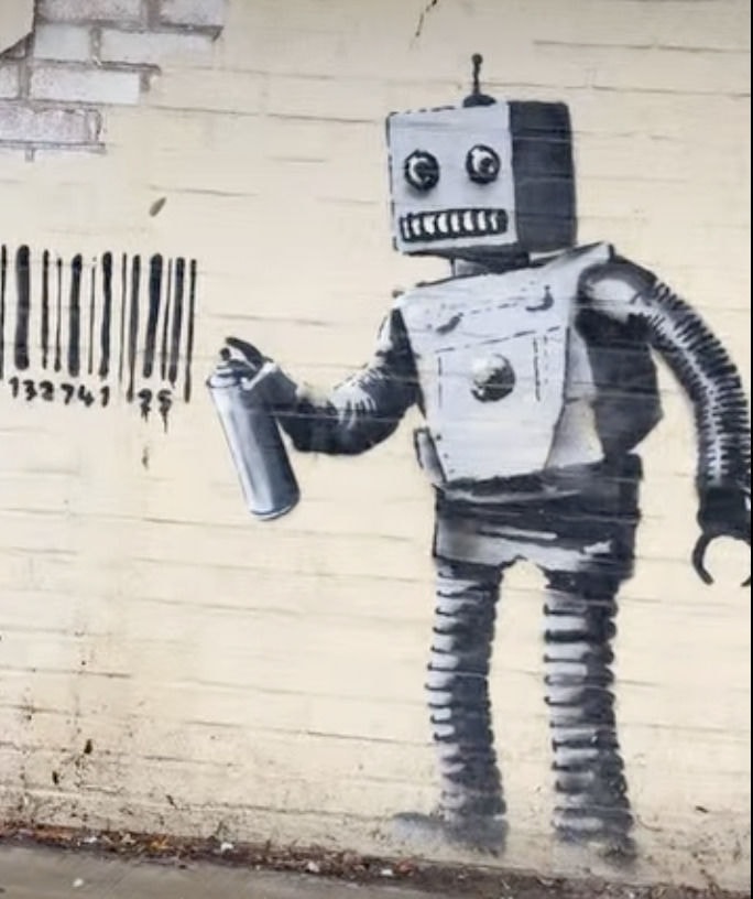 미국 브루클린에 거주 중인 한 가족이 얼굴 없는 화가 뱅크시가 자신의 집 건물 외벽에 그린 로봇 벽화를 판매했다. 사진은 뱅크시가 그린 것으로 추정되는 작품의 모습. /사진=SNS 갈무리