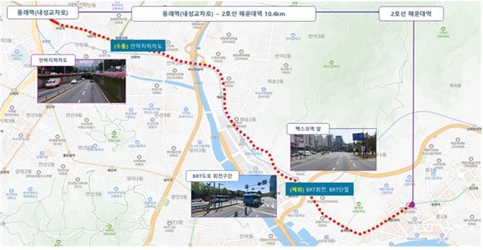 운행구간은 동래역·내성교차로부터 해운대구청어귀삼거리까지 약 10.4km다. 하루 왕복 2회 운영하고 배차간격은 60분이다. 시범운행 기간에는 요금이 무료이며 향후 정식 운행때는 시내버스 요금과 동일하게 부과될 예정이다.
