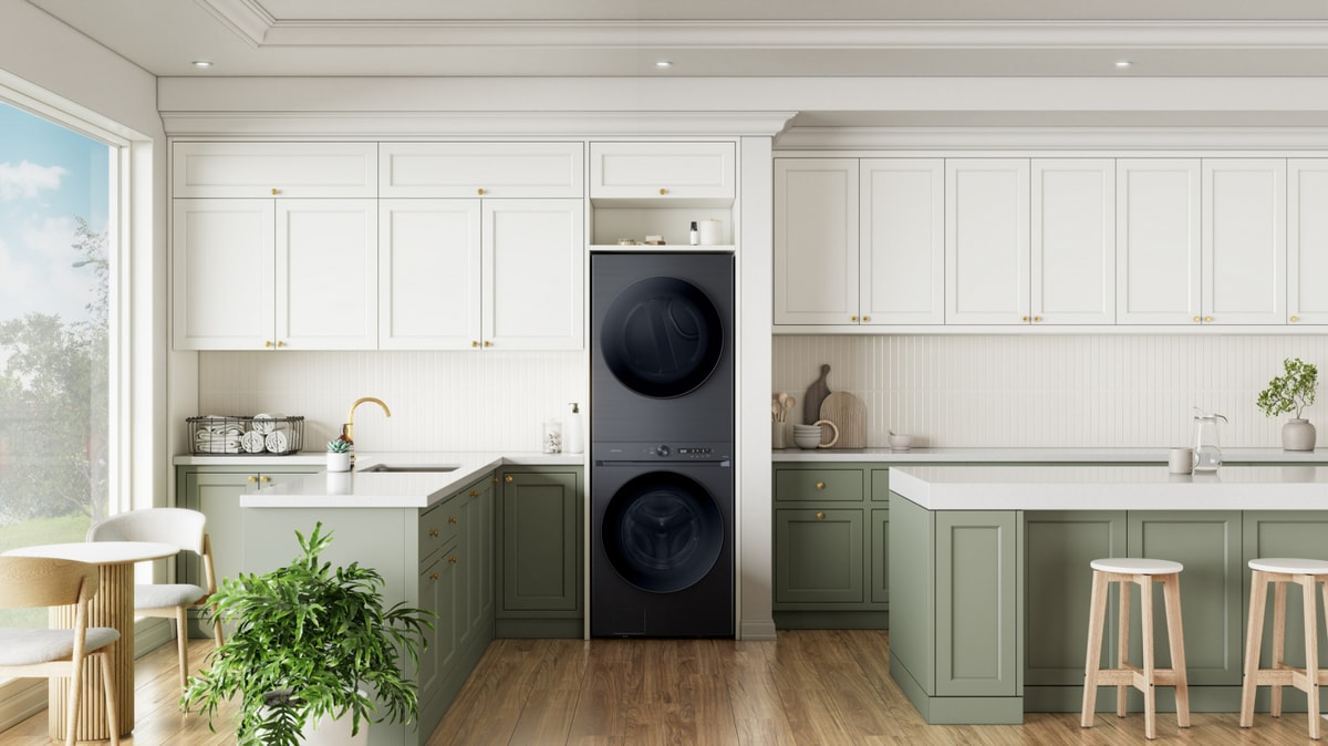 삼성전자 '비스포크 AI 원바디'는 하단 세탁기와 상단 건조기가 하나로 결합된 제품이다. 빨래 양이 많거나 분리 세탁·건조를 선호하는 소비자에게 최적의 솔루션을 제공하며 AI 기반으로 맞춤세탁과 건조를 수행하고 진동소음을 저감한다.