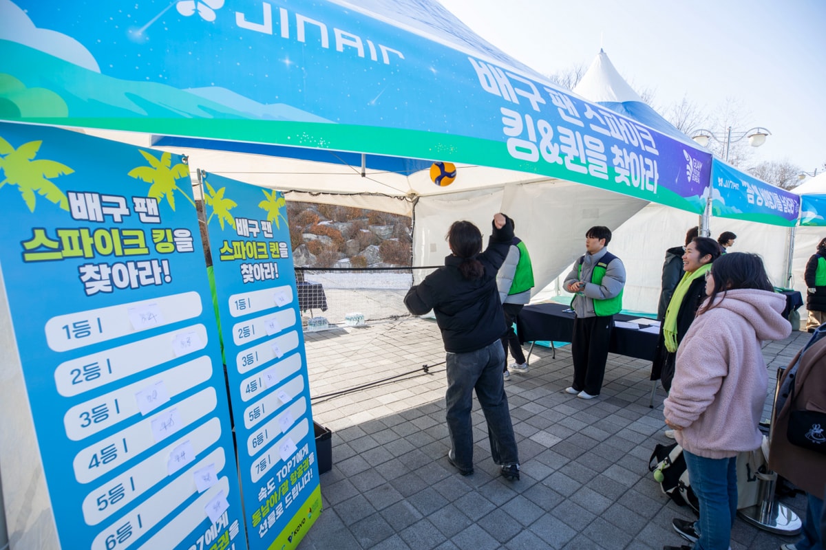 이날 경기장 야외에 마련된 브랜드 체험 부스에서는 관객들이 참여하는 프로그램이 다채롭게 진행됐다. 모형 비행기를 날려 괌 지도에 안착시키는 '괌 비행기를 날려라' 게임, 실제 선수들처럼 스파이크 속도를 측정해보는 '스파이크 서브 킹&퀸' 선발대회가 열렸다. 스파이크 대회에서는 남녀 상위 7명에게 동남아·괌 왕복 항공권을 증정해 팬들의 인기를 끌었다.