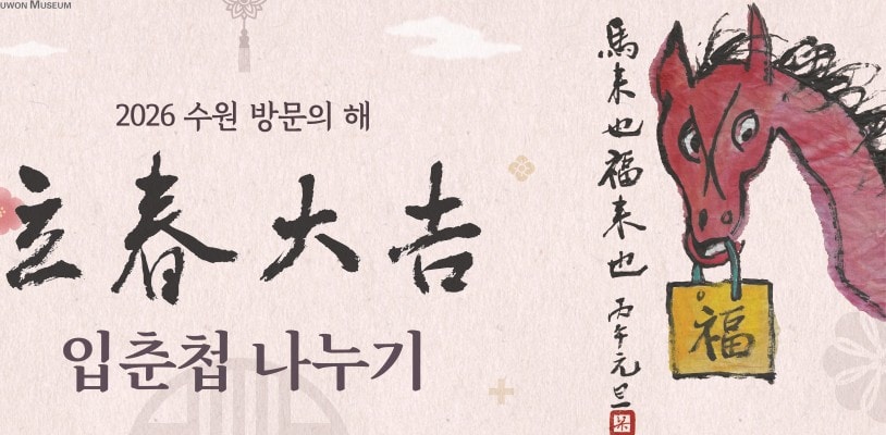 수원박물관이 2026 수원 방문의 해를 맞아 오는 31일 박물관 로비에서 세시 행사 '입춘첩 나누기'를 연다고 26일 밝혔다. 관람객에게 서예가 근당 양택동 선생의 친필 입춘첩을 배부한다.