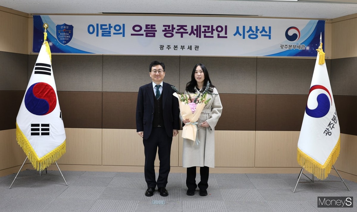 강태일 광주본부세관장(왼쪽)이 '1월 으뜸 광주세관인'으로 선정된 노현정 광주세관 주무관에게 포상한 후 기념촬영을 하고 있다/사진=광주본부세관 제공.