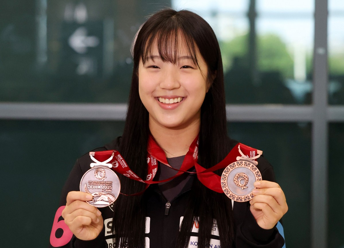 탁구 선수 신유빈(대한항공)이 첫 출전한 제79회 종합선수권에서 2관왕을 차지했다. 사진은 2025 국제탁구연맹(ITTF) 세계선수권대회에서 동메달 2개를 획득한 신유빈이 지난해 5월26일 인천국제공항 제1터미널을 통해 귀국한 후 메달을 들어 보인 모습. /사진=뉴시스