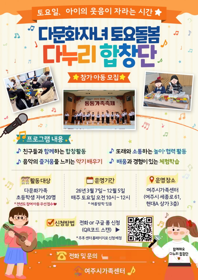 여주시가족센터 2026년 다문화자녀 토요돌봄(다누리 합창단) 참여 아동 모집 안내문. /사진제공=여주시