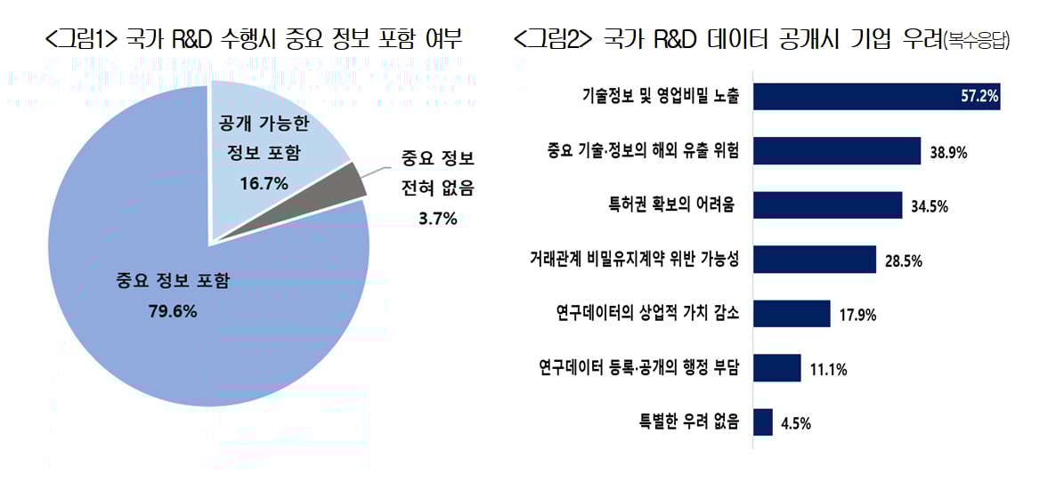 발표 자료에 따르면 기업들이 수행한 국가연구개발과제에 기업 핵심 영업비밀, 경영전략 등 중요 정보가 포함되어 있는지 묻는 질문에 참여기업 79.6%가 '유출시 피해가 우려되는 중요 정보가 포함되어 있다'고 응답했다. 16.7%의 기업은 '공개 가능한 정보들 위주로 포함됐다'고 답했고, '중요 정보가 전혀 포함되지 않았다'고 응답한 기업은 3.7%였다.