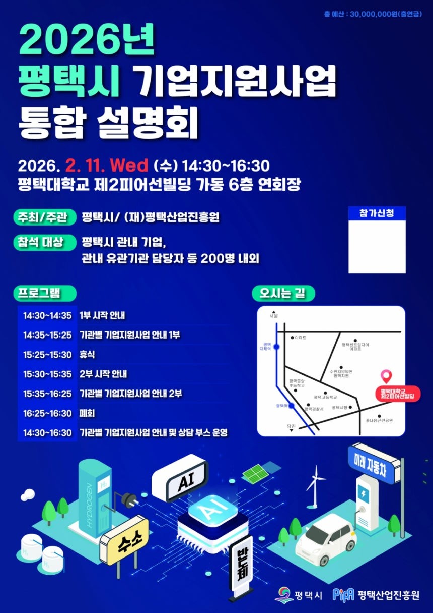 평택시(시장 정장선)가 평택산업진흥원(이하 진흥원)과 함께 다음달 11일 평택대학교 제2피어선빌딩 6층 대강당에서 '평택 중소기업 지원사업 설명회'(이하 지원사업 설명회)를 개최한다고 27일 밝혔다. 시에 따르면 이번 지원사업 설명회에서는 참석 기업을 대상으로 △자금지원 △사업화 및 기술 고도화 △수출판로개척 및 마케팅 지원 △근로 환경개선 등 다양한 분야의 중소기업 지원사업 및 일자리 등 상담 부스도 마련해 종합적으로 안내할 예정이다.