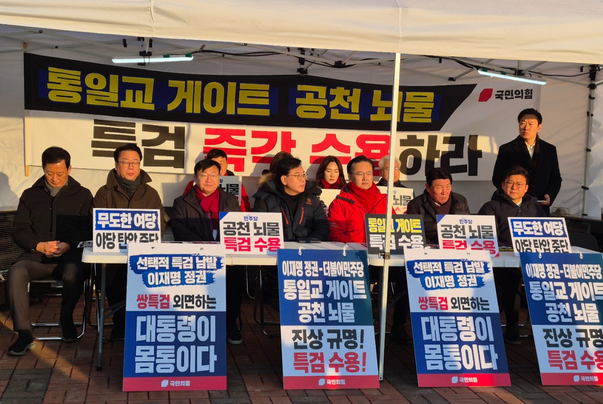 원내대책회의 직후 열린 '통일교 게이트·공천뇌물 특검법' 토론회에서도 국민의힘은 쌍특검 필요성을 역설했다. 송 원내대표는 "특검은 일반 수사기관의 공정하고 객관적인 수사를 기대하기 어렵다고 판단될 때 요구되는 것"이라며 "대통령과 국회 다수당의 통제 아래 있는 경찰·검찰·공수처는 정부 여당 인사들에 대한 엄정한 수사가 매우 어렵다는 것이 지금 현실적으로 드러나고 있다"고 말했다.