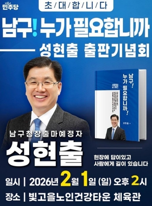 성현출 수석부회장은 당초 오는 31일 남구 빛고을노인건강타운에서 열 예정이었던 저서 '남구, 누가 필요합니까' 출판기념회를 2월1일로 변경해 개최한다고 28일 밝혔다. 행사 장소는 기존과 동일하다.