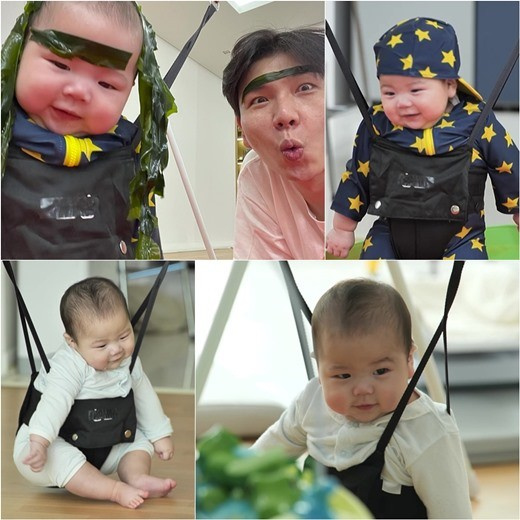 공개된 스틸 속 준범은 '미역 보이'로 변신해 발을 이용한 촉감 놀이를 하고 있는 모습. 눈썹에 미역을 붙인 준범은 아빠 제이쓴과 커플 짱구 눈썹으로 개구쟁이 미소와 빵빵한 볼살로 귀여움을 한층 더한다. 이어진 스틸 속 준범은 포실포실한 엉덩이로 허벅지로 바닥에 닿을 듯 말 듯한 치명적인 옆태로 랜선 이모들의 심장을 저격하고 있다.