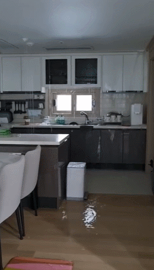 특히 부엌 천장 모서리에서 새어 나온 물은 분수처럼 콸콸콸 쏟아졌다.